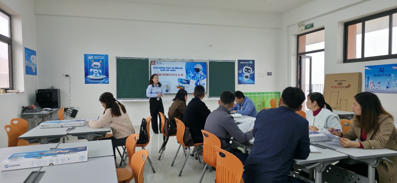 Khóa tập huấn chuyên sâu dự kiến diễn ra trong 6 ngày (từ 16/03 đến 21/03/2026) , với hình thức trực tiếp kết hợp trực tuyến. Tham gia khóa học là lớp giáo viên nòng cốt trực tiếp giảng dạy từ khối 1 đến khối 8 của nhà trường. Mục tiêu cốt lõi của chương trình là giúp đội ngũ giáo viên tiếp cận, hiểu và vận dụng thành thạo kiến thức liên môn Khoa học - Công nghệ - Kỹ thuật - Toán học vào các tình huống thực tiễn , đáp ứng mạnh mẽ yêu cầu đổi mới của Chương trình Giáo dục phổ thông 2018. Đồng thời, khóa học cũng hướng tới việc phát triển Khung năng lực số cho người học, đặc biệt là an toàn số và năng lực ứng dụng AI.
